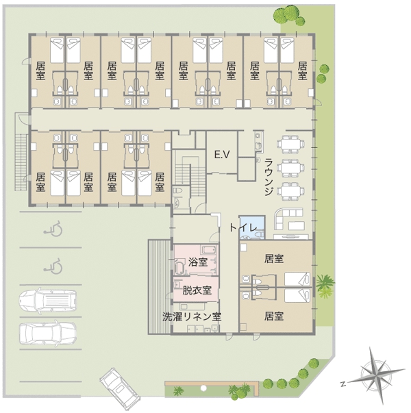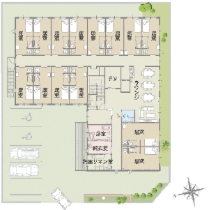所在地 多気郡明和町水池3513番地居住面積 18.28㎡(12戸) 24.88㎡( 2戸)共用部分 食堂・居間・お風呂・エレベーター設備 水洗トイレ・洗面・エアコン 洋服だんす・火災報知機 *1Fにデイサービスを併設